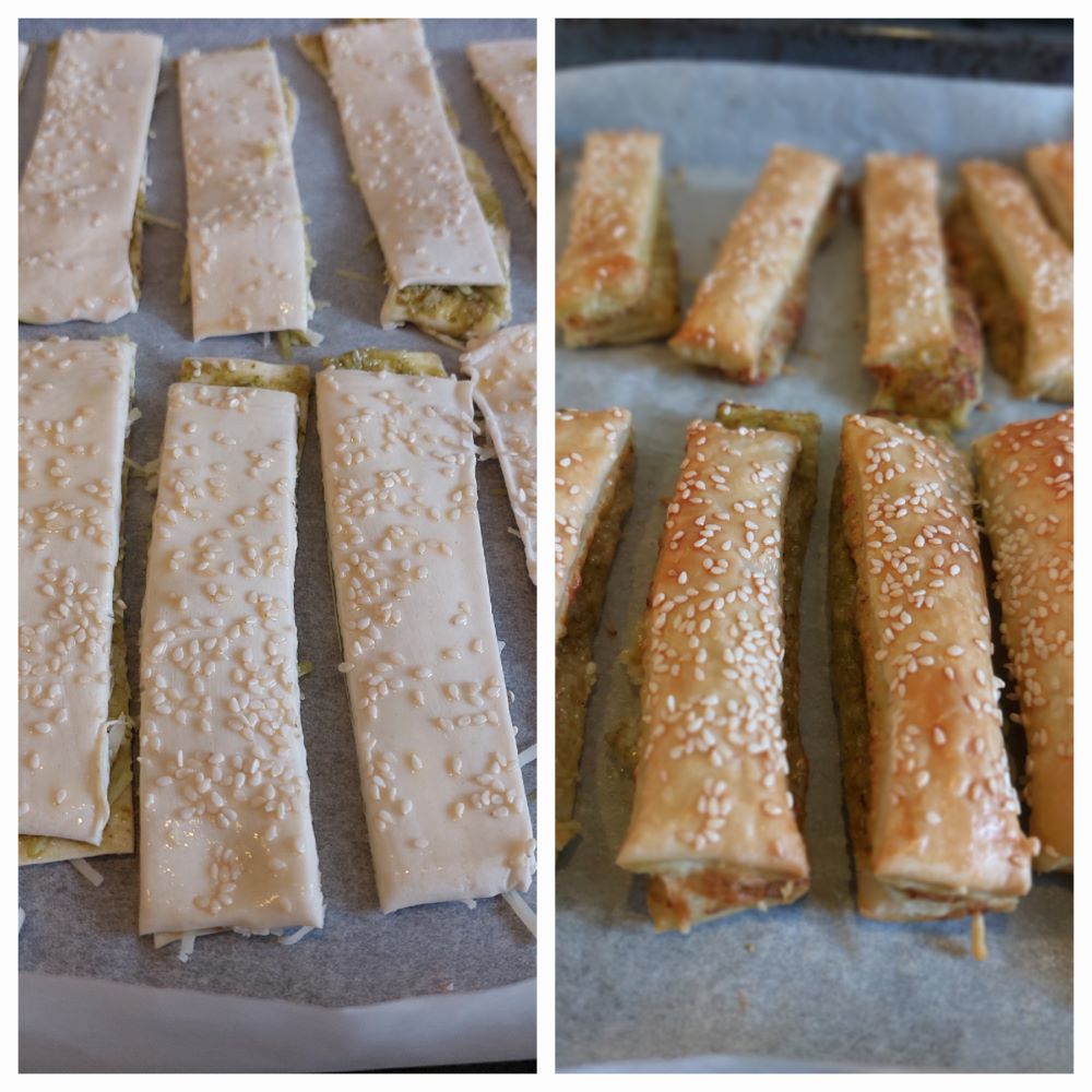 Een eenvoudig en erg lekker borrelhapje wat maar kort op de tafel zal staan. Bladerdeeg met pesto, Parmezaanse kaas en sesamzaadjes.